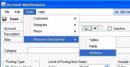 You can do that by accessing “Tools\Resource Descriptions\Windows” item of main menu of any Dexterity Window. See on the picture below.