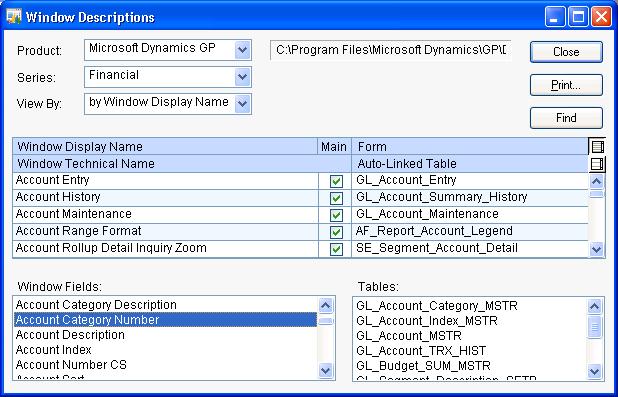 The next window appeared, “Window Descriptions”, allows accessing all elements in Dexterity Form\Window\Field hierarchy. Select Window Name in left-top list, scroll through Window Fields in left-bottom list.