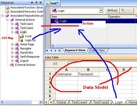 QTP provides a built-in Data Model that comes in forms of a workbook (DataTable object) and XML structure (Environment object). These objects are global, i.e. accessible from any Action. In addition, QTP automatically creates a worksheet for each new Action created. This worksheet, named after the Action, is associated with it. That creates a convenience of automatically loading Test Data, associated with Actions.