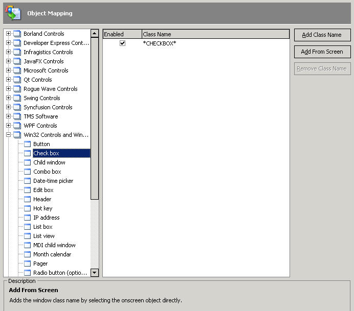The settings include two lists: the left-hand one displays object types grouped by categories; the right-hand one displays class names assigned to the selected type. To add a new class name association, select the control’s type in the list on the left, click Add Class Name and enter the desired class name. You can also press the Add From Screen button and use the subsequent Add New Object Class dialog to choose the control whose class name you would like to map.