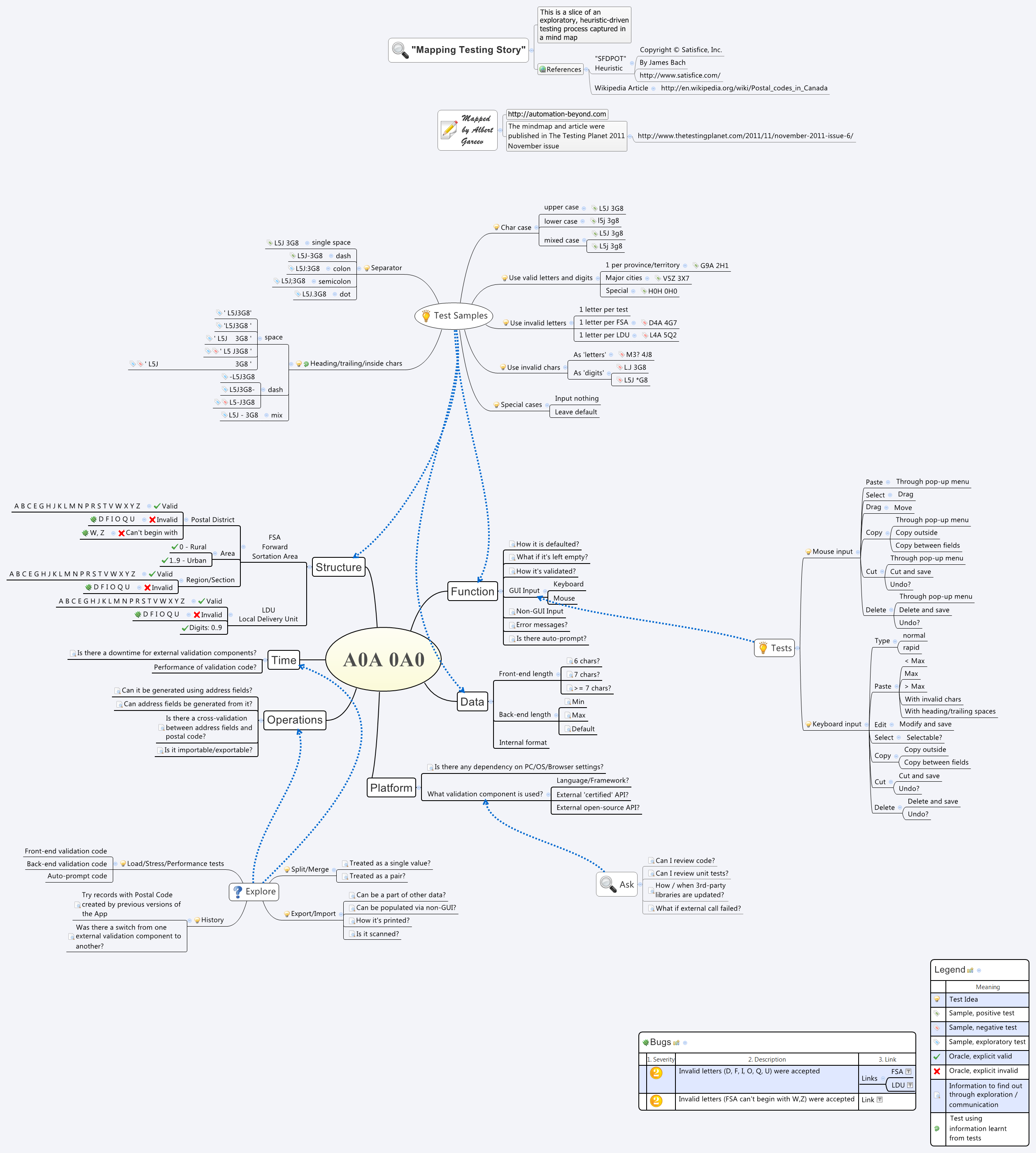 “First, let’s write down what we know and what we want to know about postal code, in general, and with regards to our application. To guide our investigation, we’ll use Structure, Function, Data, Platform, Operation, and Time categories. Those make ‘SFDPOT - San-Francisco Depot’, a mnemonic and testing heuristic created by James Bach.”