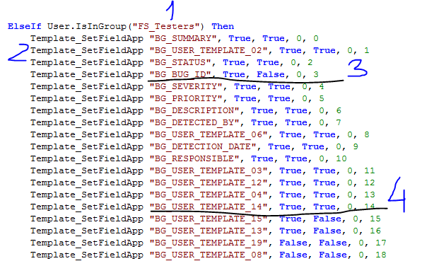 Upon saving of the settings, the wizards generate conditional (1) blocks of code (2). Note that referencing of fields is done by their database name (3, 4) which is hard-coded for the predefined fields (3) and auto-generated for custom fields (4).
